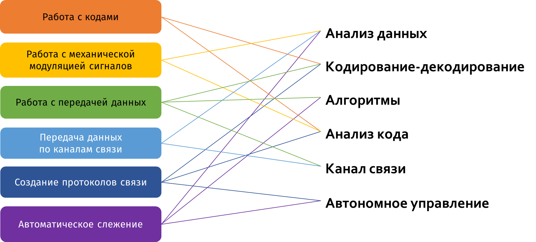 В процессе мы изучим такие темы как анализ данных, кодирование, алгоритмы, как работать с кодами, что такое канал связи и автономное управление. Данные знания тесно связанны с решением задач на всех этапах олимпиады. Предлагаем ознакомиться со схемой как каждая темя связана с финальными задачами:
