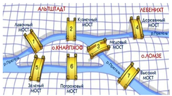 Прежде чем переходить к определению граф, немножко поговорим о задачах. Есть такая задача о Кёнигсбергских мостах. Существует семь мостов, и мы хотим их все пройти, при этом не попасть на один мост дважды, и как же это сделать?