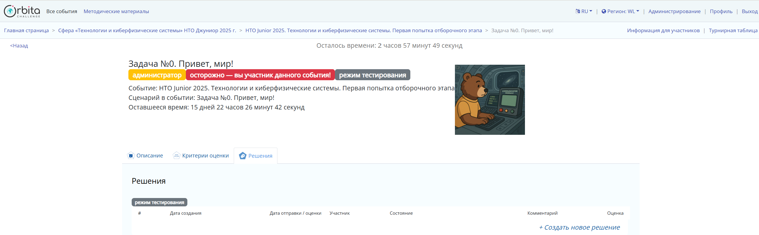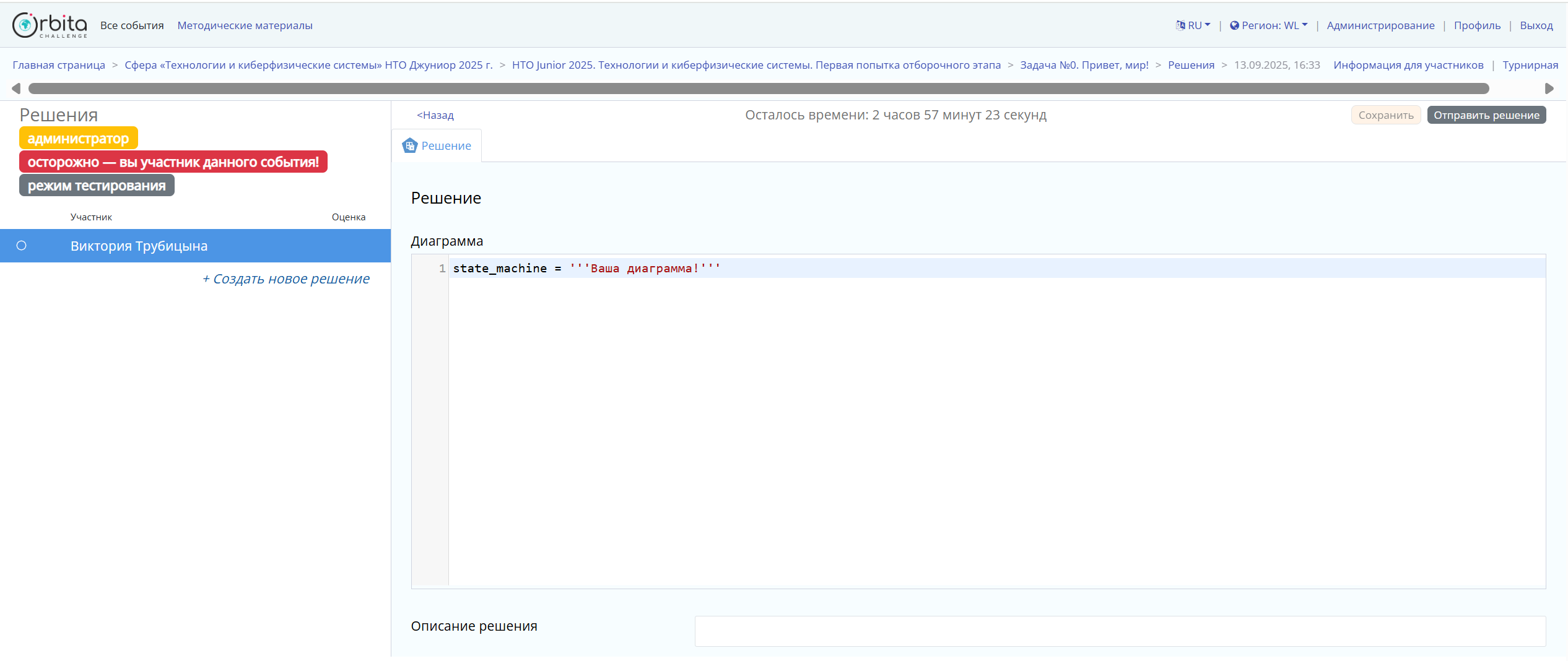 4. Кликните на сообщение + Создать новое решение — откроется поле для ввода ответа. Введите ответ. В зависимости от задачи необходимо будет ввести число, текст, выбрать вариант из предложенных или написать программный код.