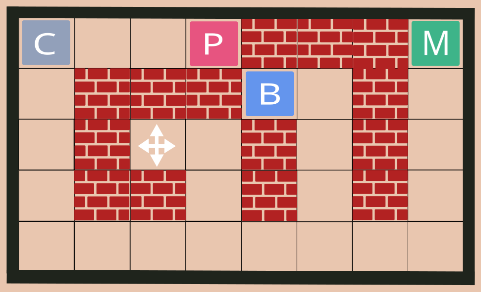 Изначально садовник располагается в стартовой точке в северо-западном углу сада, повернувшись в сторону юга. Расположение эталонного цветка помечено символом с белыми стрелками. Цветные квадраты означают пригодные для растений клетки. В – пригодная клетка для васильков. М – пригодная клетка для мяты. Р – пригодная клетка для роз. С – стартовая точка, в которую нужно вернуться в случае отсутствия эталонного цветка. В саду установлены непроходимые перегородки, через которые садовник ездить не может.