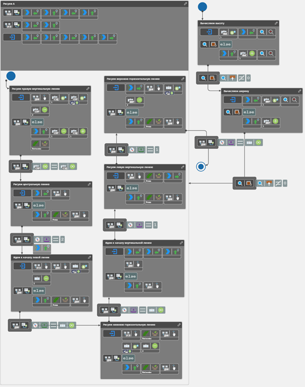 Мы делаем предварительный обход поля, чтобы узнать высоту и ширину поля, затем, используя эти данные, рисуем букву Б: вертикальная линия справа → горизонтальная линия посередине → горизонтальная линия снизу → вертикальная линия слева → горизонтальная линия сверху, затем работа машины состояний завершается. Для просчета середины координат используются два счетчика, которые считают сколько клеток спереди садовника и сколько сзади. Когда эти счетчики равны, значит, мы находимся в середине вертикальной линии, или горизонтальной.